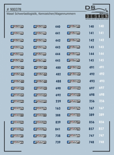 Das Decal # 900378 beinhaltet authentische Kennzeichen und Wagennummern des Schwerlastlogistikunternehmens Wasel zur Beschriftung von Schwerlast-LKW, Krane, Aufliegern etc. Die Kennzeichen und Wagennummern sind für Sattelzugmaschinen und Auflieger verwendbar.