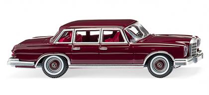 Auch das ist das Schicksal eines so renommierten Fahrzeugs: Der Mercedes Benz 600 wurde gerade einmal in 2.677 Exemplaren gebaut und blieb damit für die Stuttgarter Autobauer stets ein Zuschussgeschäft. 1966 vorgestellt, wurde der Mercedes Benz 600 bei WIKING bis 1979 im Programm gehalten, ehe die Formen im historischen Archiv verschwanden. Karosserie in weinrot hochglänzend veredelt, Inneneinrichtung rot gehalten. Kühlergrill, Fahrgestell mit Stoßstangen chromsilber lackiert. Felgen silber. Heckseitig silberner Mercedes-Benz-Stern und Typenbezeichnung „600“. Seitliche Türgriffe und Zierleisten sowie Radkasteneinfassung ebenfalls gesilbert. Scheinwerfer glasklar eingesetzt und vorher per Handbemalung silbern koloriert. Heckleuchten in karminrot ebenfalls per Hand bemalt.