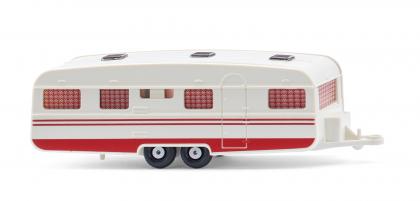 Das war auch der Grund, warum WIKING-Chef Fritz Peltzer den langen Wohnwagen auserkoren hatte und ihm sogar eine eindrucksvolle Inneneinrichtung widmete. Die Gespanne konnten sich auch in der 87-fachen Miniaturisierung sehen lassen. Aus diesem Grund wurden sie zweitweise auch in der Geschenkbox angeboten. WIKING spendiert dem Wohnwagen eine zeitgenössische Gestaltung, dazu noch eine attraktive Gardinenoptik der Fenster. Karosserie mit Dach und Achshalter perlweiß, Dachfenster topas, Einrichtung graubeige, Horizontalstreifen entsprechend des Originalvorbildes oben und unten korallenrot bedruckt. Gardinenmuster ebenfalls korallenrot mit elfenbein und schwarzrot. Rückleuchten rot bedruckt, Radfelge gesilbert.