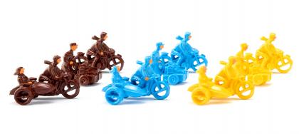 Die Motorräder mit und ohne Beiwagen, aber auch der Handwagenfahrer waren bei WIKING als gern gewähltes Zubehör gesetzt, um die große Welt der kleinen Miniaturen entstehen zu lassen. Wer sich mit der WIKING-Geschichte beschäftigt, weiß um die sinnstiftenden Gedanken des Programms der Fünfziger- und Sechzigerjahre. WIKING-Gründer Fritz Peltzer besaß damals ausgesprochenes Sendungsbewusstsein und wollte seinen Beitrag zur Verkehrserziehung leisten. Mit dem Straßenplan, den WIKING bereits auf vielfachen Sammlerwunsch als originalgetreuen Reprint vorgestellt hat, sollten die Modelle und das Zubehör ihre verkehrserzieherische Lernidee in die Kinderhände tragen. Der Handwagenfahrer und die Motorräder zählten lange Zeit dazu. Handwagenfahrer mit Gepäck, Motorrad mit Fahrer, zugehöriger Beiwagen mit Beifahrerin, Motorrad mit Fahrer. Gestaltung jeweils mahagonibraun, himmelblau und rapsgelb. Gesicht und Hände handkoloriert.