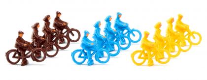 Wer heute den historischen Straßenplan ausrollte, der darf die Szenerie jetzt auch mit Radfahrern aus historischen Formen ergänzen. Paarweise revitalisiert WIKING das einstige Zubehör und lässt die miniaturisierten Verkehrsteilnehmer in drei unterschiedlichen Farben ins Programm fahren. Einst sollten die Räder fahrenden Figuren die „Verkehrsschule“ im angenäherten Maßstab 1:90 beflügeln. Dazu hatte WIKING-Gründer Fritz Peltzer gleich mehrere Straßenpläne gestalten lassen, sozusagen als verkehrsgerechte Spielfläche. Als Papierrollen waren sie über viele Jahre im Handel erhältlich und konnten mühelos auf dem Küchentisch des Hauses ausgerollt werden – lebendige Verkehrserziehung mit spielerischem Antrieb war die Idee hinter dem WIKING-Spielsystem, das einst weit über die modellbauerische Idee hinausgehen sollte. Vor einiger Zeit hatte WIKING den Verkehrsplan als Reprint wiederaufgelegt. Paarweise Gestaltung mahagonibraun, himmelblau und rapsgelb. Gesichter und Hände handkoloriert.